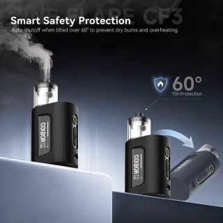 - Automatická ochrana pri náklone nad 60° okamžite zastaví produkciu dymu, čím chráni zariadenie pred poškodením a predlžuje jeho životnosť.