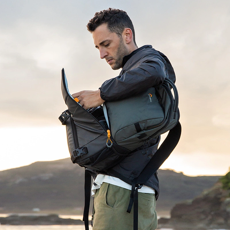 Všestranný, cestovný, trojkomorový fotobatoh Lowepro Fastpack Pro BP 250 AW III zložený z hornej komory na osobné veci, spodnej fotokomory s bočným otváraním a zadnej komory na 13" notebook. Vďaka bočnému otváraniu spodnej fotokomory vyberiete fotoaparát z batohu behom niekoľkých sekúnd! Určené pre bezzrkadlovku alebo DSLR so základným objektívom, ďalšie 2-3 objektívy alebo súpravu skladacieho dronu, statív, foto príslušenstvo, notebook a osobné veci.