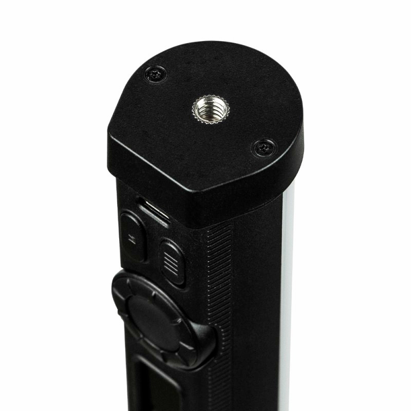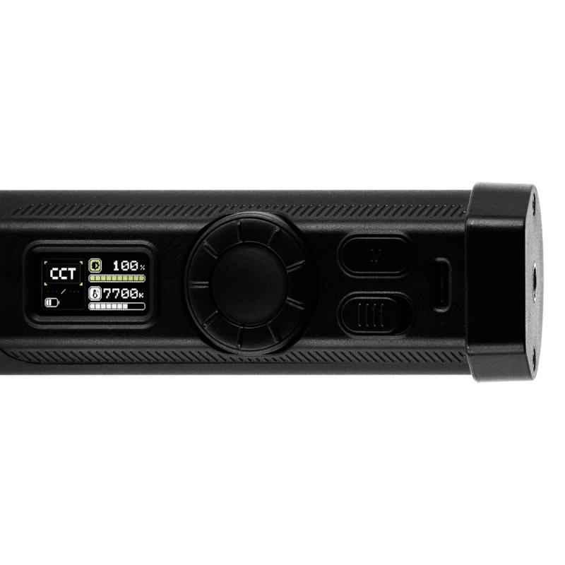 - V hornej časti trubice sa nachádza prehľadný farebný TFT displej, prepínač a funkčné tlačidlo Mode na rýchle prepínanie medzi režimami CCT, HSI a EFF, doplnené širokým otočným ovládačom na presné nastavenie teploty, farby alebo výkonu
