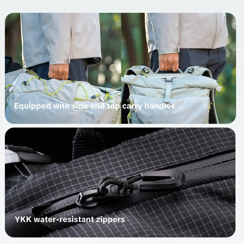 - Telo batohu je z ľahkej, ale pevnej nylonovej zmesi, navrhnutej na tvrdšie vonkajšie podmienky. Predná expanzná časť používa nepremokavý polyether TPU poťah, ktorý zvyšuje odolnosť voči roztrhnutiu a oderu, takže batoh lepšie zvláda skaly, konáre aj časté cestovanie.