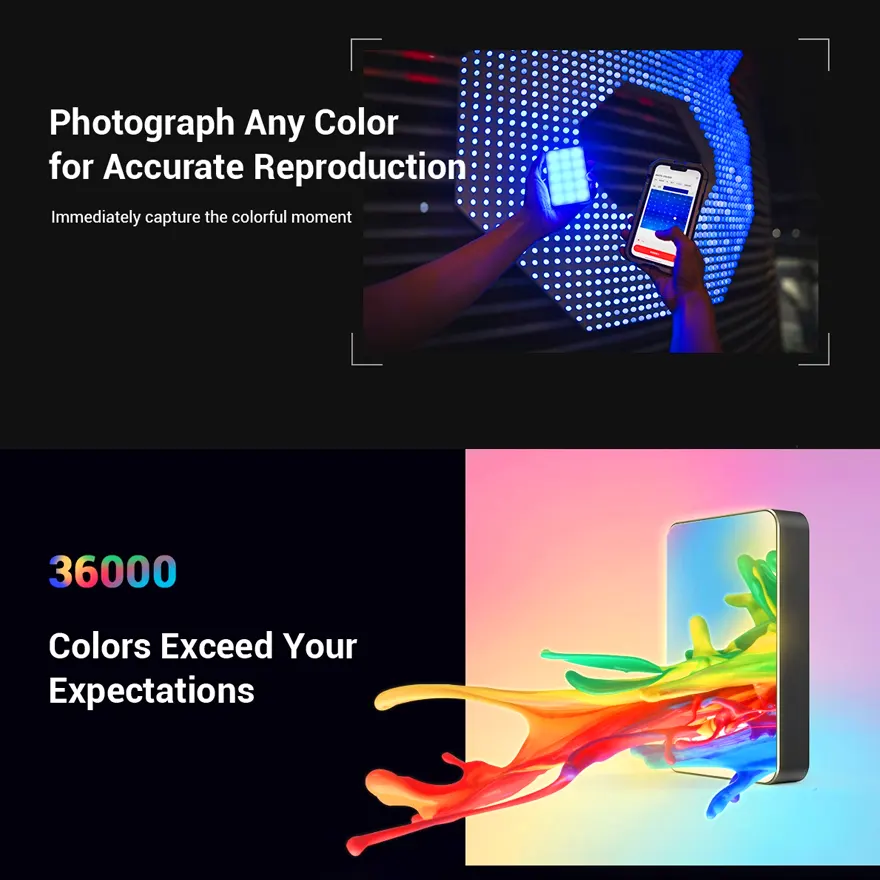 36000 farieb, hodnota CRI 96 a plná kontrola RGB umožňujú osvetlenie v rôznych prostrediach a situáciách. Rozsah teploty farieb 2500-8500K umožňuje ľubovoľne nastaviteľné teplé a studené svetlo pre 15 svetelných efektov.